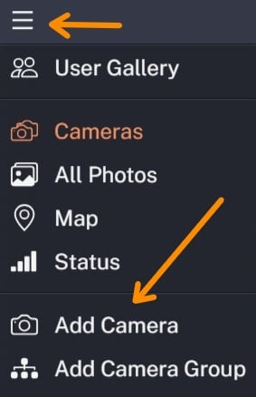 1. Once your Barn Owl HQ account is registered, click on the Main Menu in the upper left corner and then click "Add Camera."