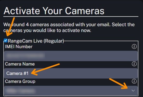 RangeCam2 and RangeCam Live Models: The IMEI is located beneath the QR code sticker on the inside of the camera door. The SIM card number is found on the SIM card itself, which is inserted into a slot on the right side of the status lights.