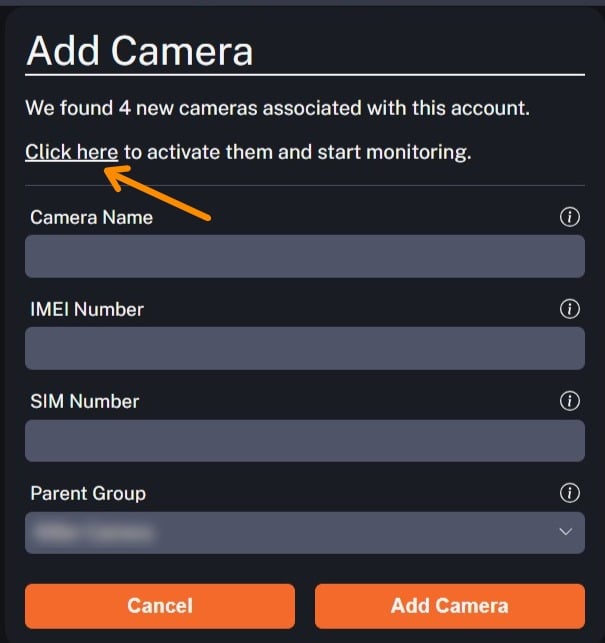 Manual Method: If you run into any issues adding your camera with the Import or QR code methods, you can register and manually add your camera. The registration process will require the IMEI and SIM numbers.