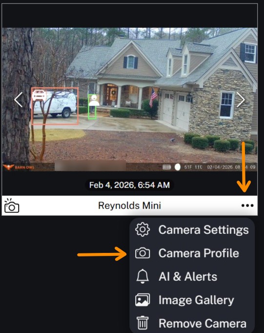 To Suspend or Activate your camera, click the 3 dots on the bottom right of your camera and then select Camera Profile.